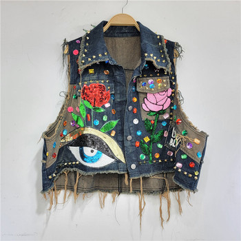 Women's Studded Rivets Embroidered Rhinestone Denim Vest Female 2024 New Ragged Washed Loose Color Blocking Short Vest Clip