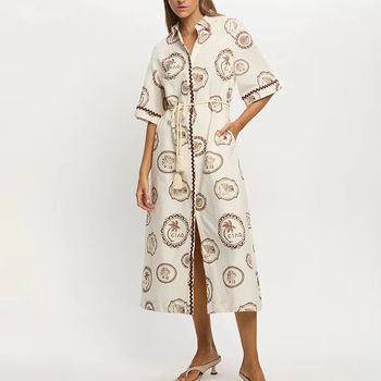 Kadınlar uzun keten tüm baskı bel kordon dantel up rahat hırka gömlek elbise