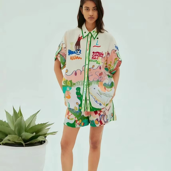 Kadın kısa kollu gömlek ve uzun pantolon pozisyonel baskı rahat tatil setleri