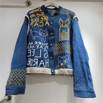 Kovboy kadın 2025 bahar yeni tasarım anlamda Graffiti karikatür yavru Stand-up yaka uzun kollu tek göğüslü ceket